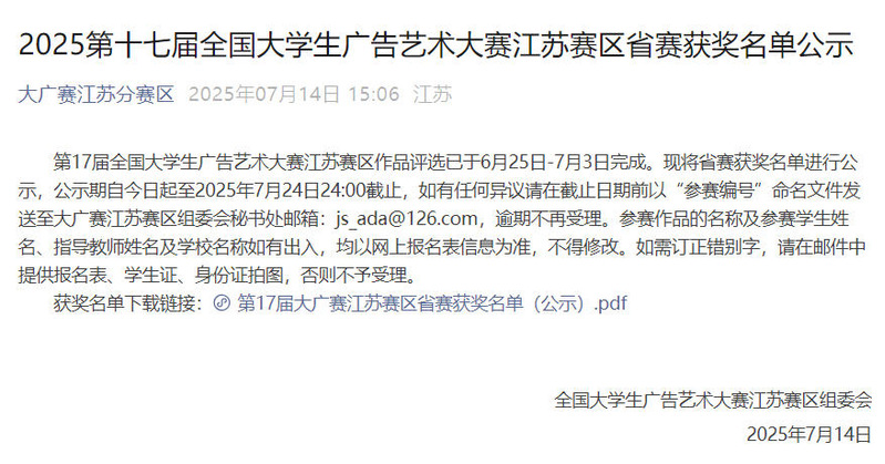 近日,第17届全国大学生广告艺术大赛江苏赛区评选结果揭晓,传媒与影视学院学子再创佳绩,以53项奖项的优异成绩刷新历史记录。其中,一等奖3项、二等奖5项、三等奖16项、优秀奖29项,较上届大赛新增6项获奖作品,一等奖、二等奖和三等奖数量均实现新突破。本届大赛中,学院师生展现出全方位的创作实力,参赛作品涵盖平面类、策划类、视频类、动画类、互动类、广播类、文案类、科技类等全部竞赛类别。全院171名学生和19名教师组成的创作团队共提交232件作品,包括157件单件作品和75组系列作品数,充分展现了学院多专业协同发展的教学成果。为确保参赛作品质量,学院采用“双轮评审+全程指导”的培育机制。在第一轮评审中,评审专家组从310件初选作品中精选174件进入复赛;第二轮评审中,专家组对新增的156件作品与复赛作品进行综合评定。广告人俱乐部学生团队全程协助,19位指导教师开展“一对一”创作指导,最终遴选出200余件精品参赛。提交作品的学生涵盖学院所有年级和专业,指导教师亦来自学院各专业。本次比赛所获佳绩是全院师生共同努力的结晶,通过“以赛促教、赛教融合”的教学创新实践,师生们完整经历了广告作品从创意构思到成品呈现的全流程,不仅积累了宝贵的实战经验,更形成了可复制的教学案例库。这些成果将反哺课堂教学,持续提升学院在新媒体广告创意与制作领域的教学水平。全国大学生广告艺术大赛是教育部认可的全国性学科竞赛之一,已成为检验高校广告艺术教育成果的重要平台。学院近年来在该项赛事中的持续突破,彰显了“理论与实践并重”的教学特色。公示通告:2025第十七届全国大学生广告艺术大赛江苏赛区省赛获奖名单公示附件:第17届大广赛江苏赛区省赛获奖名单(公示).pdf(一审:张陈杰,二审:孟宪浦,三审:韩洪政)