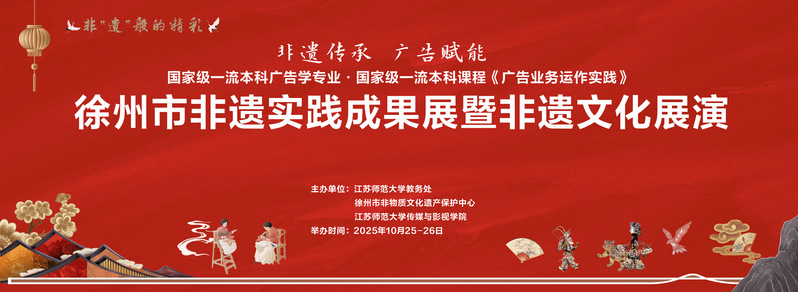 为更好的弘扬非遗文化,由徐州市非物质文化保护中心、江苏师范大学教务处举办,传媒与影视学院国家级一流本科广告学专业策划的“非遗传承,广告赋能——徐州非遗实践成果展暨非遗文化展演”将拉开帷幕。诚邀全校师生与社会各界共赴这场“传统焕新”的沉浸式之约。活动时间:10月25—26日活动地点:江苏师范大学泉山校区体育馆南侧广场主办单位:江苏师范大学教务处 徐州市非遗保护中心 江苏师范大学传媒与影视学院活动内容:集中展示60多位学生为18项徐州非遗定制的市场调研报告、营销传播策略与创意设计方案,同时举办18项非遗项目展示展演。本次展览将分为三大板块:非遗实践成果展:呈现15个本科组与5个研究生组完成的非遗市场调研报告、策划与设计方案、创意设计作品;非遗文化展演:18位非遗传承人现场展示技艺,观众可体验剪纸、面塑制作、花鸟字创作、云龙烙画,品尝老八样糕点、徐州馓子、冯天兴烧鸡、窑湾绿豆烧,感受彭祖导引养生术等非遗魅力;实践创新获奖:展现《广告业务运作实践》课程10余年来的实践创新成果,包括:2015-2025年广告系老师指导学生参加全国大学生广告艺术大赛斩获的70余项国家级奖、170余项省级奖证书;2012-2025年广告学专业学生获得的15项省优秀毕业设计。作为国家级一流本科专业,江苏师范大学广告学专业构建了“分层分阶、链式推进”的人才培养模式,深度融合学科教育与地方需求。作为社会实践类国家级一流课程,《广告业务运作实践》在上学期联合徐州市文化广电和旅游局非遗处,组织22级广告学专业47名本科生与艺术设计15名研究生,深入调研马庄香包、徐州汉绣、邳州纸塑狮子头等18项非遗,完成从市场调研、传承与传播策划到创意设计的全流程实践。所有方案均获被传承人采纳应用,成为非遗现代化转型的“青年智慧方案”。“这不仅是一门课的结课汇报,更是专业服务社会、文化对接创新的生动实践,是对广告学专业人才培养质量的一次检阅。”展览旨在通过“可触、可品、可感”的形式,推动非遗在当代生活中的活态传承,促进创新创意型人才培养再谱新篇章!笔墨已染非遗色,创意正续传承歌。我们深信,您的莅临将为这场文化与教育的对话增添无上光彩。期盼与您共聚,见证汉风薪火在广告赋能的微光中,照亮更加辽远的未来!