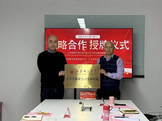 随后,双方共同举行了“江苏师范大学大学生就业实习实训基地”授牌仪式。会后,在崔威总经理的陪同下,韩洪政一行参观了鸿淦数字人才实训基地。