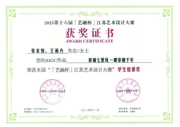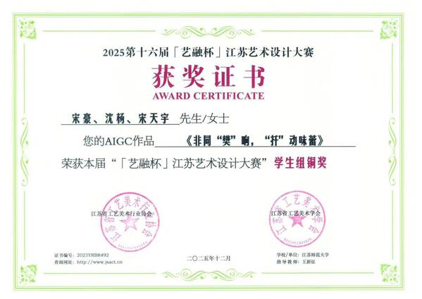 近日,第六届江苏省大学生视听智能影像创新大赛(原江苏省大学生摄影大赛)与第十六届“艺融杯”江苏艺术设计大赛获奖名单相继揭晓。传媒与影视学院学子在视听智能影像创新大赛中共斩获金奖1项、优秀奖3项;在“艺融杯”中共斩获银奖1项、铜奖2项。在本届江苏省大学生视听智能影像创新大赛中,钟濯寒同学的作品(指导教师:陈岩)荣获非专业组金奖;杨环毓同学(指导教师:朱斌)获短视频组优秀奖;由宋楠萍和孙灿小组、管可欣同学(指导教师:张超)提交的作品在人工智能影像组荣获优秀奖。在本届“艺融杯”中,由王新征老师指导,张家悦、王雨卉同学的AIGC作品荣获银奖;宋豪、沈杨、宋天宇同学的AIGC作品,以及管可欣、刘琦、冯敏捷同学的视觉传达作品分别荣获铜奖。据悉,这两场赛事均为省级认定赛事。江苏省大学生视听智能影像创新大赛旨在引导青年学子以智能影像技术参与社会实践,本届大赛共收到全省七十余所高校2900余组作品,类别涵盖短视频、纪实摄影、人工智能作品等7类。“艺融杯”旨在成为发掘优质设计作品、培育新锐设计人才的核心平台,本届大赛共收到参赛作品3598件,其中学生作品3292件,涵盖视觉传达、数字媒体AIGC等6大类别。(一审:佟彤,二审:张陈杰,三审:韩洪政)